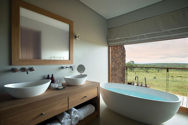 The Main Lodge has a large viewing sundeck where guests are welcome to bide away the time. The crystal clear swimming pool is blessedly cool and inviting on hot summer days under the African sun. The central dining room, bar, outdoor Boma, Spa and Gym are all situated in or around the Main Lodge and are easily accessible from the chalets. A nearby chalet houses a library and entertainment centre. Four luxuriously appointed private Villas, including the Presidential, two bedroomed Thlou Villa, are located along the ridge overlooking the waterhole and adjacent plains with the Waterberg Mountains in the distance. A maximum of 10 guests may stay at the lodge, ensuring personal attention and care from your hosts at all times. Each Villa has its own elegant sense of style and decor, designed to make you feel pampered, spoiled and special. The bedroom doors exit onto your private viewing sundeck where you can relax and watch Africa pass by below you.