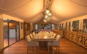 The decor and furnishings of Tau Game Lodge are Africa-inspired and the rooms are equipped with both air-conditioning and ceiling fans. The rustic thatched chalets are spread out in U-formation on either side of the lodge, offering excellent views of animals approaching the water from the opposite bank. Each chalet has its own wooden game viewing deck, which allows one to experience the bush in privacy and is equipped with an en-suite bathroom and open-air shower.