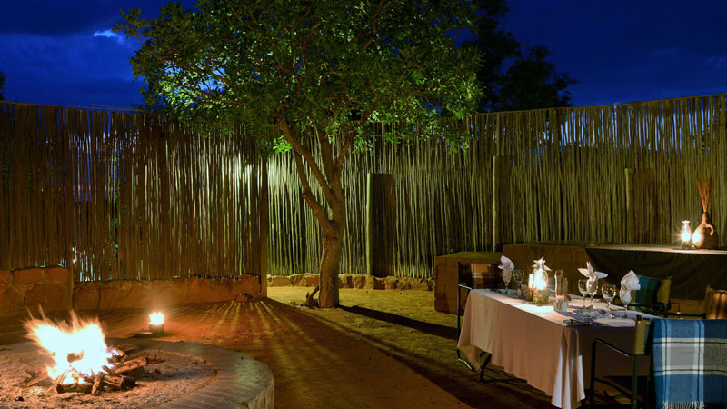 Safari Suites – Within walking distance of the main lodge are the tented camps. Lantern lit paths lead to Kifu (desire), Matumba (magic potion), Rafiki (friend), Madiba (old man), Safiri (journey) & Utambo (space), finding easy residence within Acacia-thorn and Bushveld. The interior appointments draw inspiration from the colonial ethos, with only the wildlife as witness of the invigorating outside shower for two. Joined by the glaze African sky, these king size units redefine the concept of solitude. Here, after an exhilarating day in the African bush you can journey into dreams.