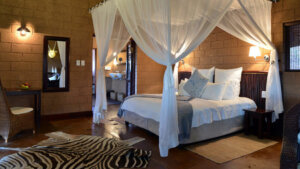 Main Lodge Rooms – consist of 3 luxury en-suite rooms. The Rhino Room is a standard queen size suite, with en-suite shower and a private balcony. The Cheetah Room is a queen size suite, furnished in true African style, complemented with balcony with a breath-taking view of the bush. As a nightcap enjoy evening viewing of the game from your private balcony overlooking the waterhole. The Elephant Room is a spacious king size suite with private balcony and “His & Hers” en-suite bathrooms, one containing a bath and another with shower.